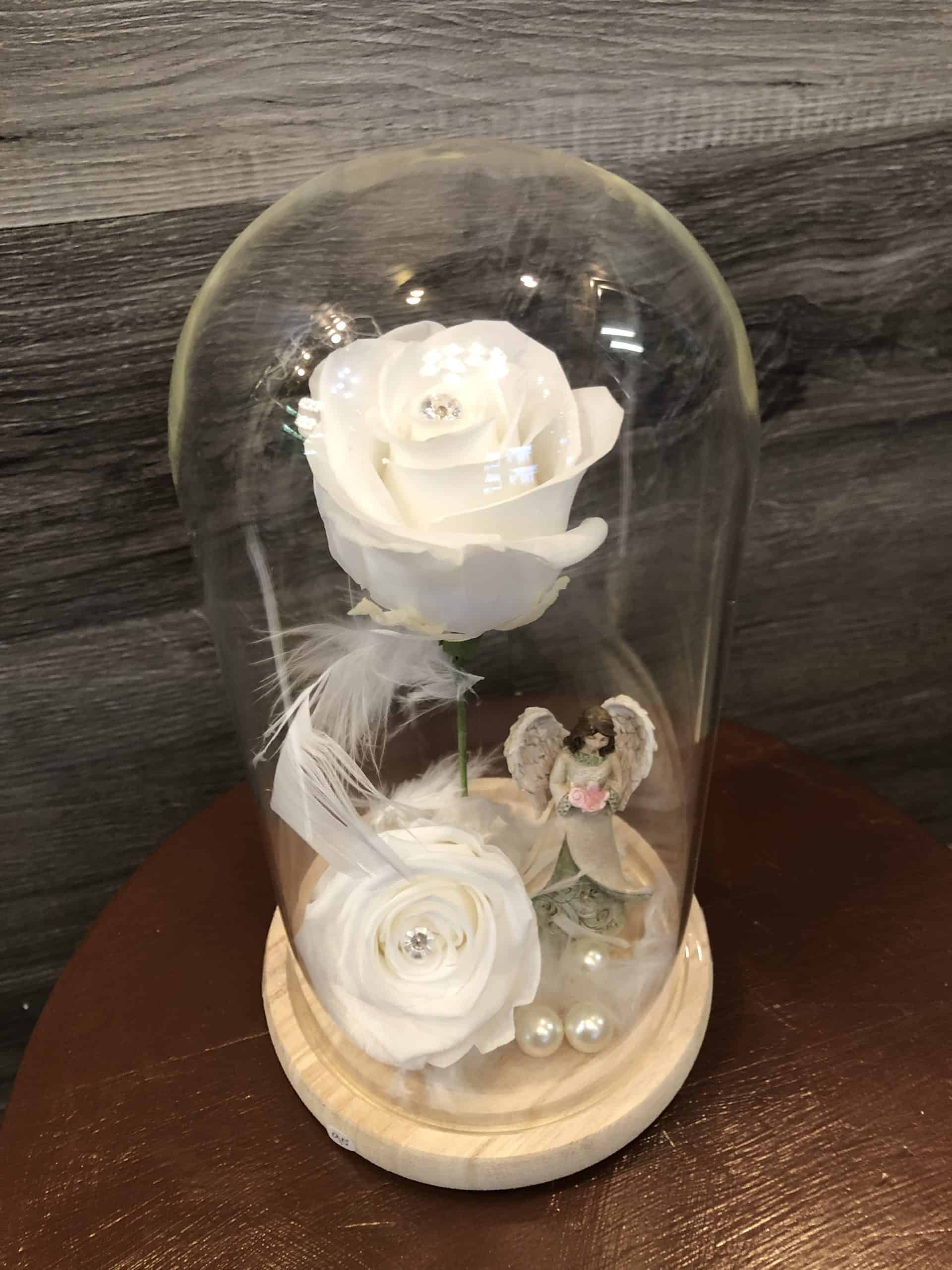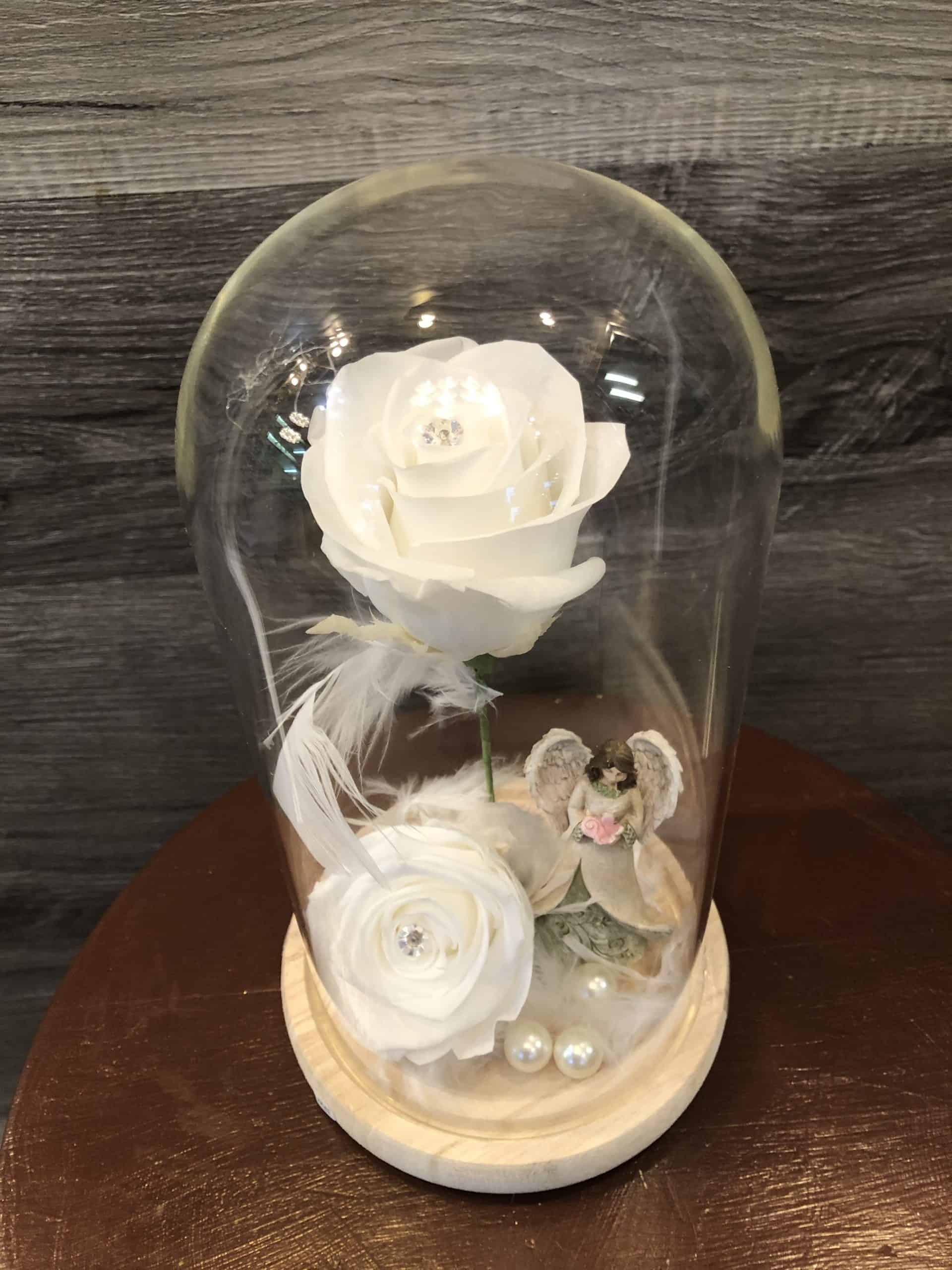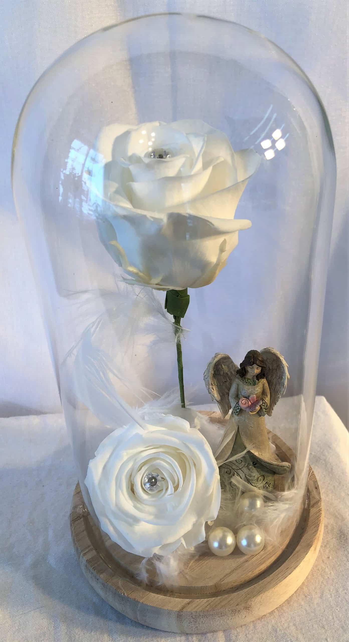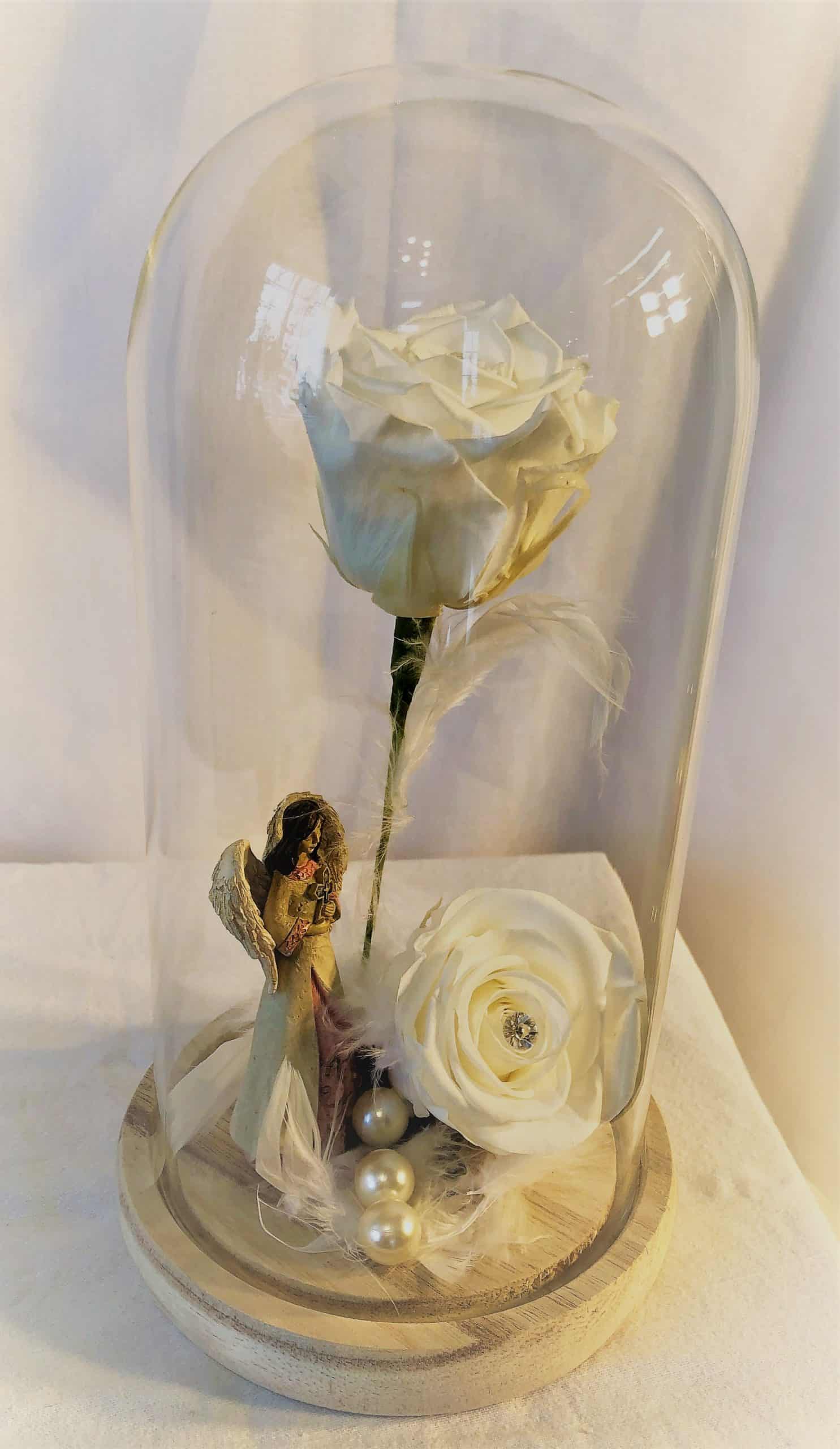 Ange et Roses Éternelles Blanches sous cloche de verre.